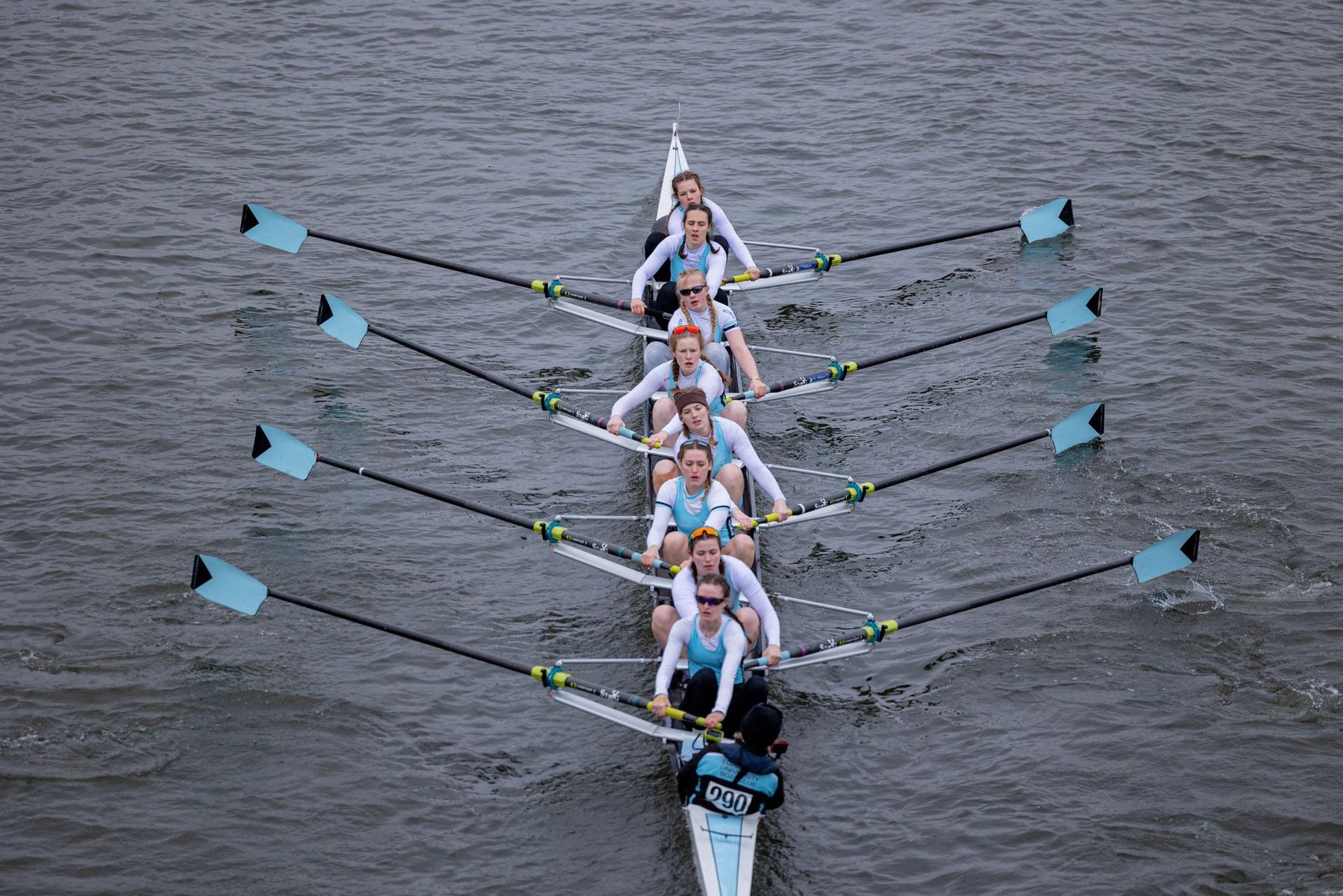 After two days of preparation, our crews took to the water and rowed to the start in chilly but decent conditions, with a little head wind between the Bandstand and Chiswick. First off was the First VIII, starting sixth. After what was described as a good row, they were timed eighth fastest over the course, a great achievement with two GB crews ahead of them and the usual Leander entries. Later, our crew was given a 10sec time penalty which pushed them to tenth; however, their result was positive in comparison to the usual rivals and bodes well for the racing coming.